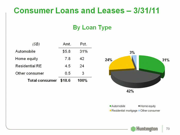 | Consumer Loans and Leases - 3/31/11 ($B) Amt. Pct. Automobile $5.8 31% Home equity 7.8 42 Residential RE 4.5 24 Other consumer 0.5 3 Total consumer $18.6 100% (CHART) By Loan Type 73 |