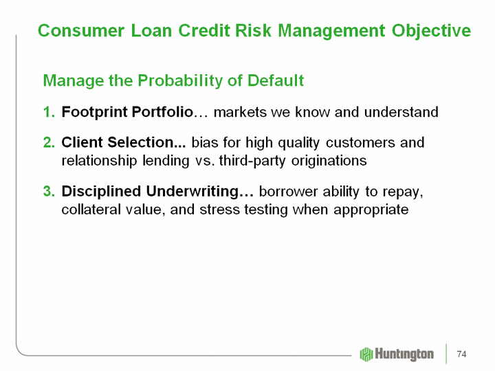 | Consumer Loan Credit Risk Management Objective Manage the Probability of DefaultFootprint Portfolio... markets we know and understandClient Selection... bias for high quality customers and relationship lending vs. third-party originationsDisciplined Underwriting... borrower ability to repay, collateral value, and stress testing when appropriate 74 |