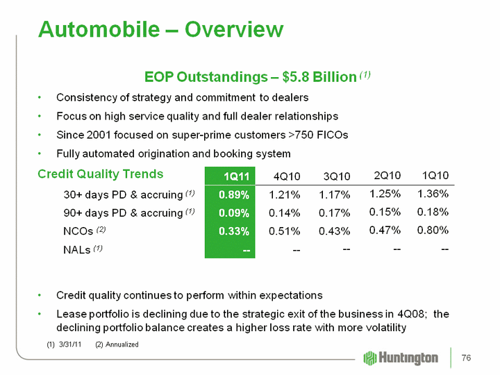 | Automobile - Overview EOP Outstandings - $5.8 Billion (1)Consistency of strategy and commitment to dealersFocus on high service quality and full dealer relationshipsSince 2001 focused on super-prime customers >750 FICOsFully automated origination and booking systemCredit Quality Trends Credit quality continues to perform within expectationsLease portfolio is declining due to the strategic exit of the business in 4Q08; the declining portfolio balance creates a higher loss rate with more volatility 3/31/11 (2) Annualized 1Q11 4Q10 3Q10 2Q10 1Q10 30+ days PD & accruing (1) 0.89% 1.21% 1.17% 1.25% 1.36% 90+ days PD & accruing (1) 0.09% 0.14% 0.17% 0.15% 0.18% NCOs (2) 0.33% 0.51% 0.43% 0.47% 0.80% NALs (1) -- -- -- -- -- 76 |