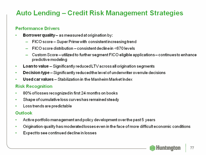 | Auto Lending - Credit Risk Management Strategies Performance DriversBorrower quality - as measured at origination by:FICO score - Super Prime with consistent increasing trend FICO score distribution - consistent decline in <670 levels Custom Score - utilized to further segment FICO eligible applications - continues to enhance predictive modelingLoan to value - Significantly reduced LTV across all origination segmentsDecision type - Significantly reduced the level of underwriter overrule decisionsUsed car values - Stabilization in the Manheim Market IndexRisk Recognition 80% of losses recognized in first 24 months on booksShape of cumulative loss curves has remained steadyLoss trends are predictable Outlook Active portfolio management and policy development over the past 5 yearsOrigination quality has moderated losses even in the face of more difficult economic conditionsExpect to see continued decline in losses 77 |