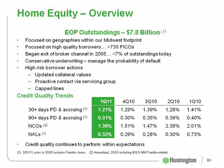 | Home Equity - Overview EOP Outstandings - $7.8 Billion (1)Focused on geographies within our Midwest footprintFocused on high quality borrowers... >730 FICOsBegan exit of broker channel in 2005... <7% of outstandings todayConservative underwriting - manage the probability of defaultHigh risk borrower actionsUpdated collateral valuesProactive contact via servicing groupCapped linesCredit Quality TrendsCredit quality continues to perform within expectations 3/31/11; prior to 2Q10 includes Franklin loans (2) Annualized; 2Q10 including $15.9 MM Franklin-related 1Q11 4Q10 3Q10 2Q10 1Q10 30+ days PD & accruing (1) 1.21% 1.29% 1.39% 1.28% 1.41% 90+ days PD & accruing (1) 0.31% 0.30% 0.35% 0.36% 0.40% NCOs (2) 1.38% 1.51% 1.47% 2.36% 2.01% NALs (1) 0.32% 0.29% 0.28% 0.30% 0.73% 80 |