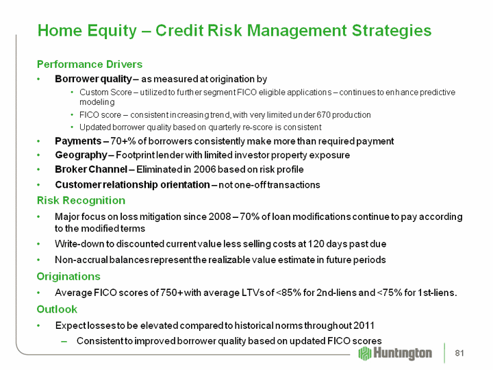 | Home Equity - Credit Risk Management Strategies Performance DriversBorrower quality - as measured at origination byCustom Score - utilized to further segment FICO eligible applications - continues to enhance predictive modeling FICO score - consistent increasing trend, with very limited under 670 productionUpdated borrower quality based on quarterly re-score is consistent Payments - 70+% of borrowers consistently make more than required paymentGeography - Footprint lender with limited investor property exposureBroker Channel - Eliminated in 2006 based on risk profileCustomer relationship orientation - not one-off transactions Risk Recognition Major focus on loss mitigation since 2008 - 70% of loan modifications continue to pay according to the modified termsWrite-down to discounted current value less selling costs at 120 days past dueNon-accrual balances represent the realizable value estimate in future periods OriginationsAverage FICO scores of 750+ with average LTVs of <85% for 2nd-liens and <75% for 1st-liens. OutlookExpect losses to be elevated compared to historical norms throughout 2011Consistent to improved borrower quality based on updated FICO scores 81 |