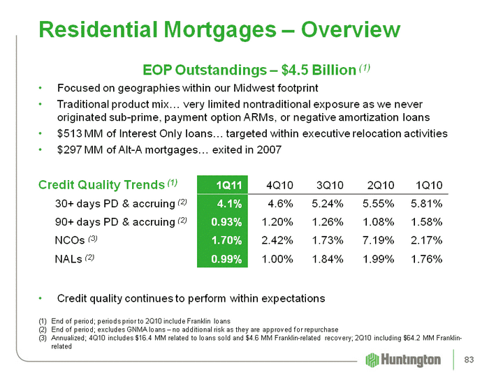 | Residential Mortgages - Overview EOP Outstandings - $4.5 Billion (1)Focused on geographies within our Midwest footprintTraditional product mix... very limited nontraditional exposure as we never originated sub-prime, payment option ARMs, or negative amortization loans$513 MM of Interest Only loans... targeted within executive relocation activities$297 MM of Alt-A mortgages... exited in 2007Credit Quality Trends (1)Credit quality continues to perform within expectations End of period; periods prior to 2Q10 include Franklin loansEnd of period; excludes GNMA loans - no additional risk as they are approved for repurchaseAnnualized; 4Q10 includes $16.4 MM related to loans sold and $4.6 MM Franklin-related recovery; 2Q10 including $64.2 MM Franklin- related 1Q11 4Q10 3Q10 2Q10 1Q10 30+ days PD & accruing (2) 4.1% 4.6% 5.24% 5.55% 5.81% 90+ days PD & accruing (2) 0.93% 1.20% 1.26% 1.08% 1.58% NCOs (3) 1.70% 2.42% 1.73% 7.19% 2.17% NALs (2) 0.99% 1.00% 1.84% 1.99% 1.76% 83 |
