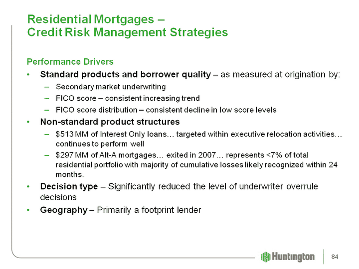 | Residential Mortgages - Credit Risk Management Strategies Performance DriversStandard products and borrower quality - as measured at origination by:Secondary market underwritingFICO score - consistent increasing trendFICO score distribution - consistent decline in low score levels Non-standard product structures$513 MM of Interest Only loans... targeted within executive relocation activities... continues to perform well$297 MM of Alt-A mortgages... exited in 2007... represents <7% of total residential portfolio with majority of cumulative losses likely recognized within 24 months.Decision type - Significantly reduced the level of underwriter overrule decisionsGeography - Primarily a footprint lender 84 |
