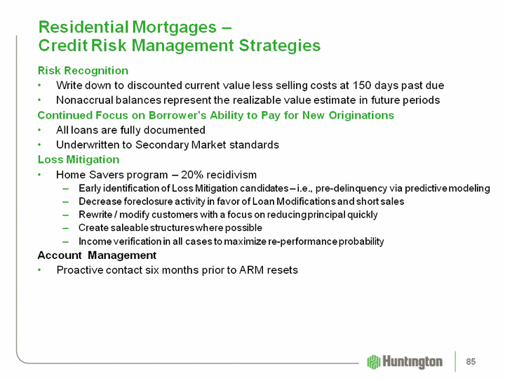 | Residential Mortgages - Credit Risk Management Strategies Risk RecognitionWrite down to discounted current value less selling costs at 150 days past dueNonaccrual balances represent the realizable value estimate in future periodsContinued Focus on Borrower's Ability to Pay for New OriginationsAll loans are fully documentedUnderwritten to Secondary Market standardsLoss MitigationHome Savers program - 20% recidivismEarly identification of Loss Mitigation candidates - i.e., pre-delinquency via predictive modeling Decrease foreclosure activity in favor of Loan Modifications and short salesRewrite / modify customers with a focus on reducing principal quicklyCreate saleable structures where possibleIncome verification in all cases to maximize re-performance probabilityAccount ManagementProactive contact six months prior to ARM resets 85 |