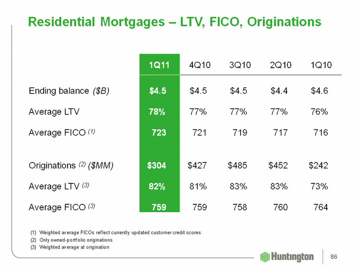 | Residential Mortgages - LTV, FICO, Originations (1) Weighted average FICOs reflect currently updated customer credit scores(2) Only owned-portfolio originationsWeighted average at origination 1Q11 4Q10 3Q10 2Q10 1Q10 Ending balance ($B) $4.5 $4.5 $4.5 $4.4 $4.6 Average LTV 78% 77% 77% 77% 76% Average FICO (1) 723 721 719 717 716 Originations (2) ($MM) $304 $427 $485 $452 $242 Average LTV (3) 82% 81% 83% 83% 73% Average FICO (3) 759 759 758 760 764 86 |
