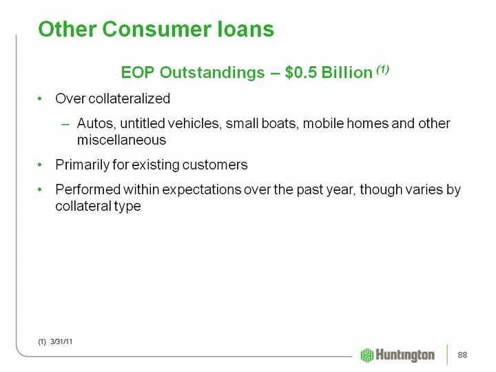 | Other Consumer loans EOP Outstandings - $0.5 Billion (1)Over collateralizedAutos, untitled vehicles, small boats, mobile homes and other miscellaneousPrimarily for existing customersPerformed within expectations over the past year, though varies by collateral type (1) 3/31/11 88 |