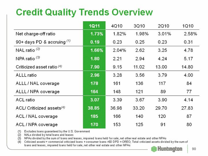 | Credit Quality Trends Overview Credit Quality Trends Overview Excludes loans guaranteed by the U.S. Government NALs divided by total loans and leases(3) NPAs divided by the sum of loans and leases, impaired loans held for sale, net other real estate and other NPAs(4) Criticized assets = commercial criticized loans + consumer loans >60 DPD + OREO; Total criticized assets divided by the sum of loans and leases, impaired loans held for sale, net other real estate and other NPAs 90 |