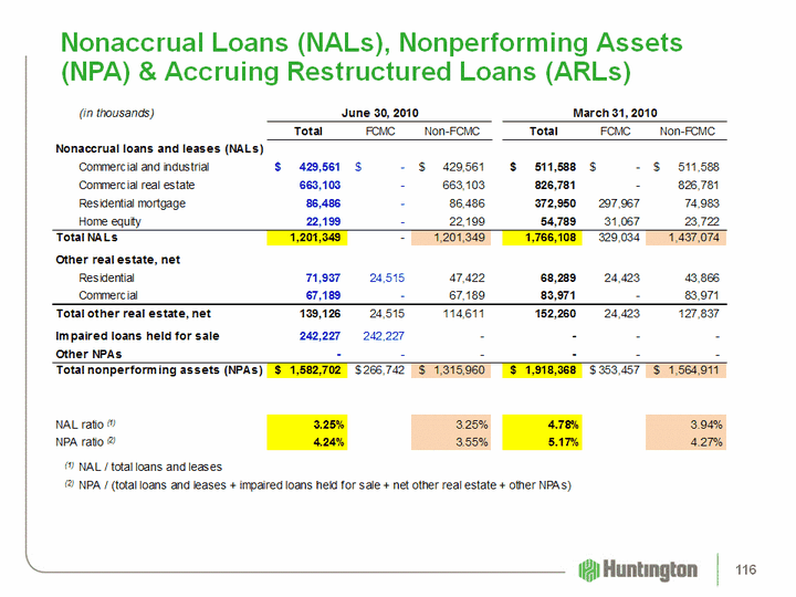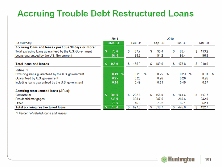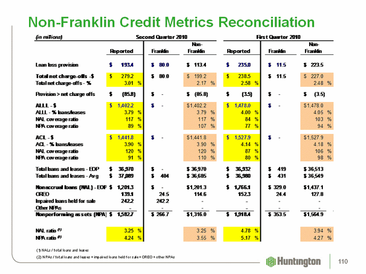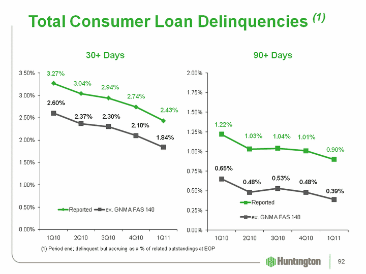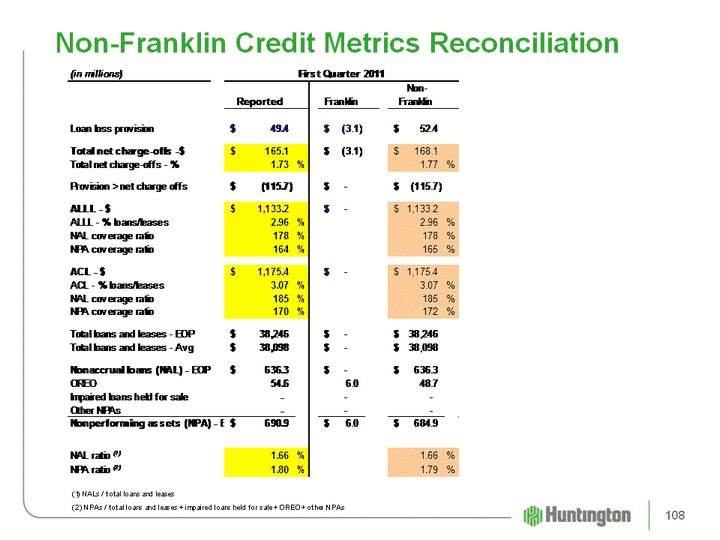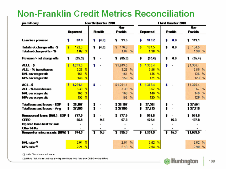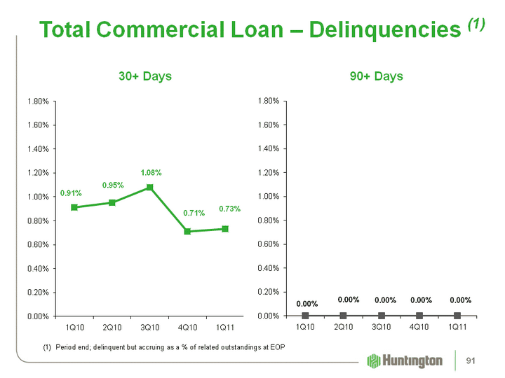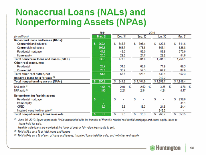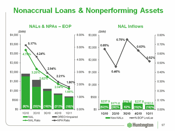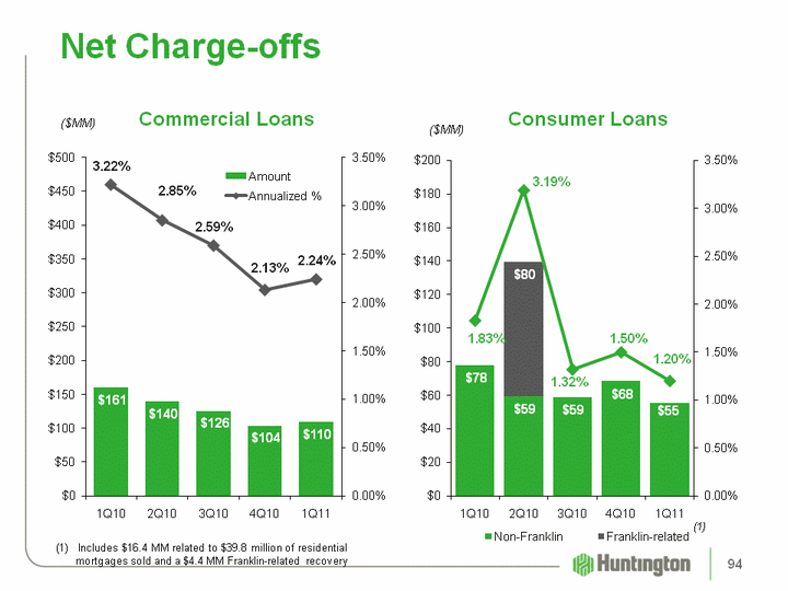 | Net Charge-off Ratios (1) 1Q11 4Q10 3Q10 2Q10 1Q10 Commercial and industrial 1.29% 1.85% 2.01% 1.90% 2.45% Commercial real estate 4.15 2.64 3.60 4.44 4.44 Total commercial 2.24 2.13 2.59 2.85 3.22 Automobile 0.33 0.51 0.43 0.47 0.80 Home equity 1.38 1.51 1.47 2.36 2.01 Residential mortgages (2) 1.70 2.42 1.73 7.19 2.17 Other 3.47 3.66 3.83 3.81 3.87 Total consumer 1.20 1.50 1.32 3.19 1.83 Total 1.73% 1.82% 1.98% 3.01% 2.58% Memo: Excluding Franklin-related NCOs (3) Memo: Excluding Franklin-related NCOs (3) Memo: Excluding Franklin-related NCOs (3) Commercial and industrial 1.29% 1.86% 2.15% 1.90% 2.46% Home equity 1.38 1.51 1.41 1.53 1.83 Residential mortgages (2) 1.97 2.82 1.42 1.74 1.57 Total 1.77 1.87 1.98 2.17 2.48 Annualized4Q10 Includes $16.4 million, related to the sale of $39.8 million of residential mortgages See non-Franklin credit metrics reconciliation 96 |