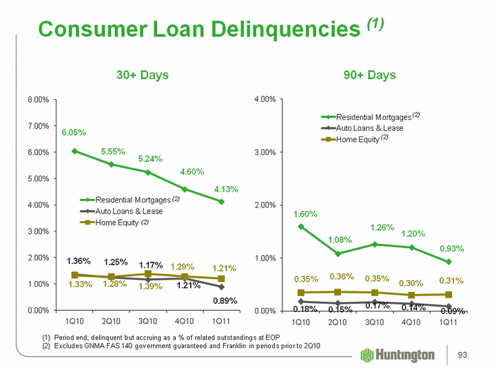 | Consumer Loan Delinquencies (1) (CHART) (1) Period end; delinquent but accruing as a % of related outstandings at EOP(2) Excludes GNMA FAS 140 government guaranteed and Franklin in periods prior to 2Q10 (CHART) (2) (2) (2) (2) 90+ Days 30+ Days 93 |