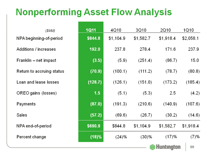 | ($MM) 1Q11 4Q10 3Q10 2Q10 1Q10 NPA beginning-of-period $844.8 $1,104.9 $1,582.7 $1,918.4 $2,058.1 Additions / increases 192.0 237.8 278.4 171.6 237.9 Franklin - net impact (3.5) (5.9) (251.4) (86.7) 15.0 Return to accruing status (70.9) (100.1) (111.2) (78.7) (80.8) Loan and lease losses (128.7) (126.1) (151.0) (173.2) (185.4) OREO gains (losses) 1.5 (5.1) (5.3) 2.5 (4.2) Payments (87.0) (191.3) (210.6) (140.9) (107.6) Sales (57.2) (69.6) (26.7) (30.2) (14.6) NPA end-of-period $690.9 $844.8 $1,104.9 $1,582.7 $1,918.4 Percent change (18)% (24)% (30)% (17)% (7)% Nonperforming Asset Flow Analysis 99 |