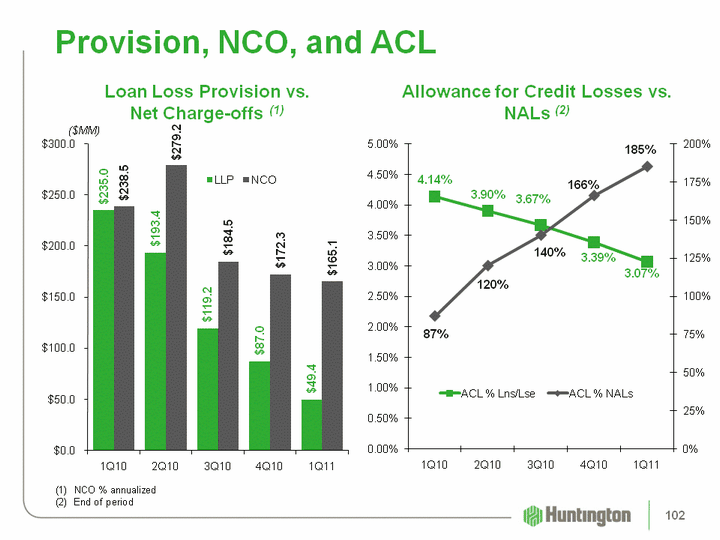 | (CHART) Provision, NCO, and ACL ($MM) (1) NCO % annualizedEnd of period (CHART) Allowance for Credit Losses vs.NALs (2) Loan Loss Provision vs.Net Charge-offs (1) 102 |
