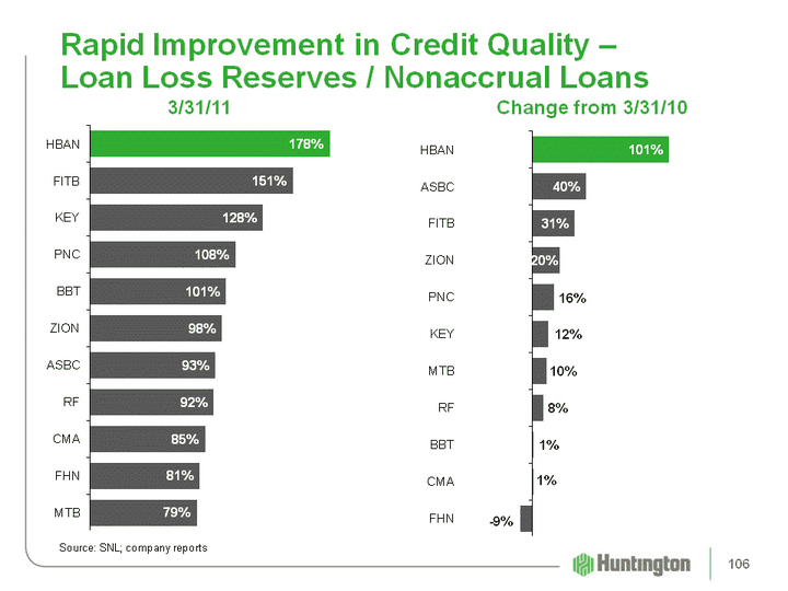 | Rapid Improvement in Credit Quality - Loan Loss Reserves / Nonaccrual Loans (CHART) (CHART) Source: SNL; company reports 3/31/11 Change from 3/31/10 106 |
