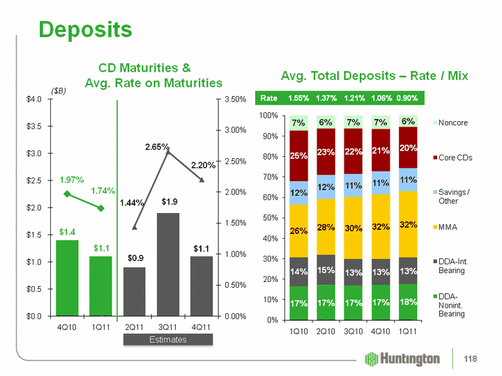 | (CHART) (CHART) Deposits ($B) Avg. Total Deposits - Rate / Mix CD Maturities & Avg. Rate on Maturities Rate 1.55% 1.37% 1.21% 1.06% 0.90% Estimates 118 |