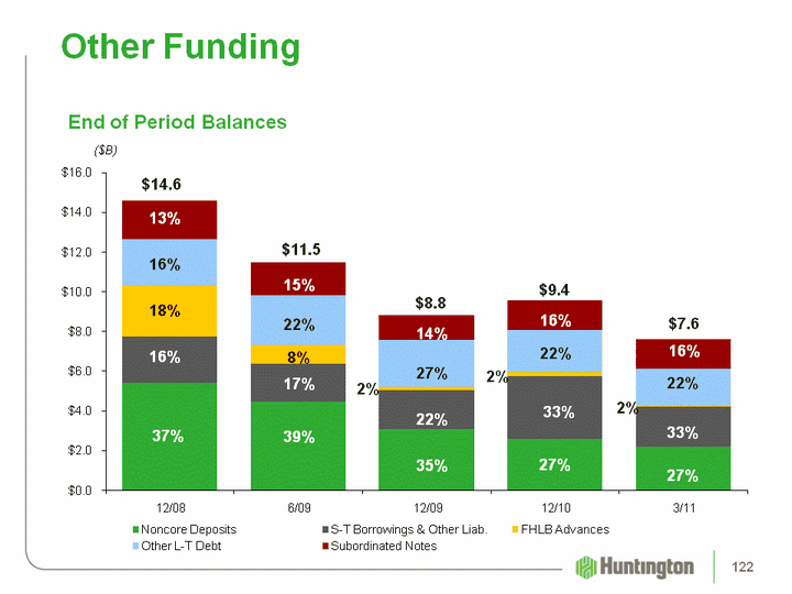 | (CHART) Other Funding End of Period Balances ($B) $14.6 $11.5 13% 22% 16% 15% 8% 18% 39% 37% 17% 16% $8.8 14% 27% 2% 35% 22% $7.6 16% 22% 2% 27% 33% $9.4 16% 22% 2% 27% 33% 122 |