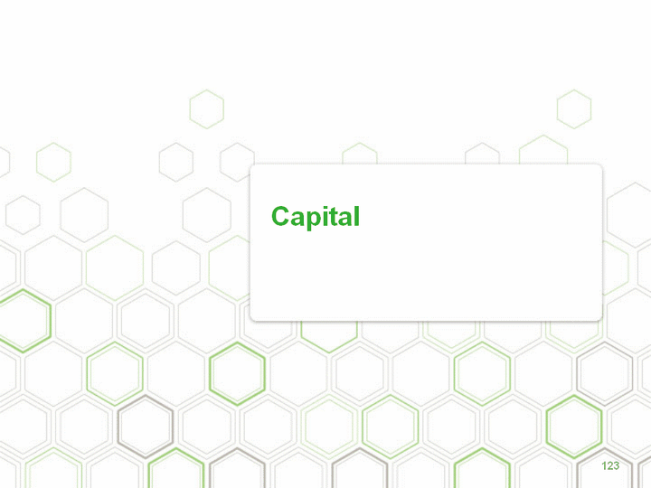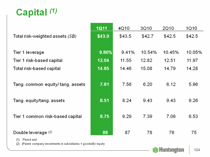 | Capital (1) 1Q11 4Q10 3Q10 2Q10 1Q10 Total risk-weighted assets ($B) $43.0 $43.5 $42.7 $42.5 $42.5 Tier 1 leverage 9.80% 9.41% 10.54% 10.45% 10.05% Tier 1 risk-based capital 12.04 11.55 12.82 12.51 11.97 Total risk-based capital 14.85 14.46 15.08 14.79 14.28 Tang. common equity/ tang. assets 7.81 7.56 6.20 6.12 5.96 Tang. equity/tang. assets 8.51 8.24 9.43 9.43 9.26 Tier 1 common risk-based capital 9.75 9.29 7.39 7.06 6.53 Double leverage (2) 88 87 78 76 75 (1) Period end (2) (Parent company investments in subsidiaries + goodwill) / equity 124 |