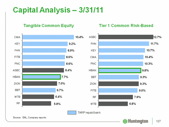 | (CHART) Capital Analysis - 3/31/11 (CHART) Source: SNL, Company reports. Tier 1 Common Risk-Based Tangible Common Equity TARP repaid bank 127 |