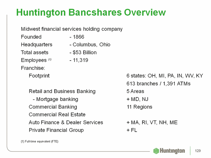 | Huntington Bancshares Overview Midwest financial services holding companyFounded - 1866Headquarters - Columbus, OhioTotal assets - $53 Billion Employees (1) - 11,319Franchise: Footprint 6 states: OH, MI, PA, IN, WV, KY 613 branches / 1,391 ATMs Retail and Business Banking 5 Areas - Mortgage banking + MD, NJ Commercial Banking 11 Regions Commercial Real Estate Auto Finance & Dealer Services + MA, RI, VT, NH, ME Private Financial Group + FL (1) Full-time equivalent (FTE) 129 |