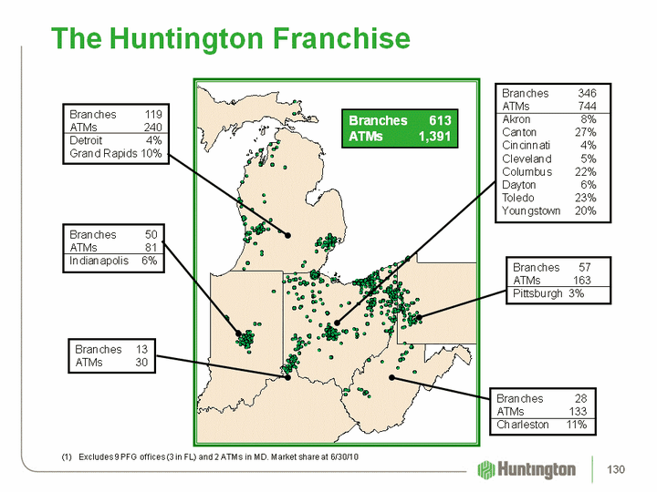 | The Huntington Franchise Branches 119ATMs 240Detroit 4%Grand Rapids 10% Branches 346ATMs 744Akron 8%Canton 27%Cincinnati 4%Cleveland 5%Columbus 22%Dayton 6%Toledo 23% Youngstown 20% Branches 50ATMs 81Indianapolis 6% Branches 13ATMs 30 Branches 28ATMs 133Charleston 11% Excludes 9 PFG offices (3 in FL) and 2 ATMs in MD. Market share at 6/30/10 Branches 613ATMs 1,391 Branches 57ATMs 163Pittsburgh 3% 130 |