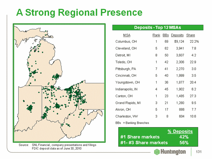 | A Strong Regional Presence Source: SNL Financial, company presentations and filings FDIC deposit data as of June 30, 2010 Deposits - Top 12 MSAs MSA Rank BBs Deposits ShareColumbus, OH 1 69 $9,124 22.2%Cleveland, OH 5 62 3,941 7.8Detroit, MI 8 50 3,607 4.2Toledo, OH 1 42 2,306 22.9Pittsburgh, PA 7 41 2,270 3.0Cincinnati, OH 5 40 1,999 3.5Youngstown, OH 1 36 1,877 20.4Indianapolis, IN 4 45 1,902 6.2Canton, OH 1 23 1,485 27.3Grand Rapids, MI 3 21 1,280 9.5Akron, OH 5 17 886 7.7Charleston, WV 3 8 604 10.6BBs = Banking Branches % Deposits#1 Share markets 42% #1- #3 Share markets 56% 131 |