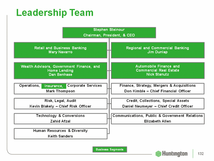 | Business Segment Overview Commercial BankingExecutive - Jim Dunlap11 Region PresidentsMiddle Market Commercial BankingSpecialty BankingLarge CorporateHealth-careNot-for-ProfitEquipment / Technology LeasingInternational ServicesTreasury ManagementCapital MarketsDerivativesForeign ExchangeSecurities Trading Retail & Business BankingExecutive - Mary NavarroBranch Sales and Service5 Retail Banking AreasConsumer BankingBusiness BankingIn-Store BranchesDeposit Product Pricing and FeesMarketing and Customer ExperiencePayments and Channels 139 |
