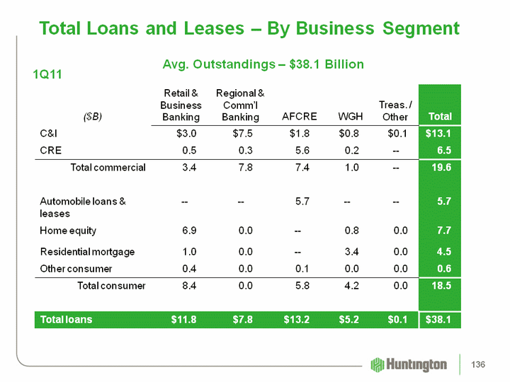 | Total Loans and Leases - By Business Segment Total Loans and Leases - By Business Segment Avg. Outstandings - $38.1 Billion 1Q11 136 |