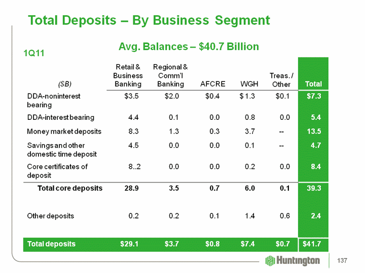 | Total Deposits - By Business Segment Total Deposits - By Business Segment Avg. Balances - $40.7 Billion 1Q11 137 |