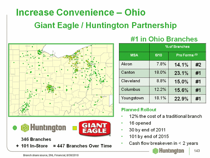 | #1 in Ohio BranchesPlanned Rollout12% the cost of a traditional branch16 opened30 by end of 2011101 by end of 2015Cash flow breakeven in < 2 years Increase Convenience - Ohio Branch share source, SNL Financial, 6/30/2010 % of Branches % of Branches % of Branches MSA 6/10 Pro Forma (1) Pro Forma (1) Akron 7.8% 14.1% #2 Canton 18.0% 23.1% #1 Cleveland 8.8% 15.0% #1 Columbus 12.2% 15.6% #1 Youngstown 18.1% 22.9% #1 346 Branches + 101 In-Store = 447 Branches Over Time Giant Eagle / Huntington Partnership 143 143 |