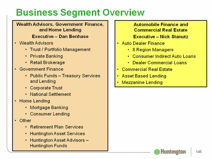 | Business Segment Overview Wealth Advisors, Government Finance, and Home Lending Executive - Dan BenhaseWealth AdvisorsTrust / Portfolio ManagementPrivate BankingRetail BrokerageGovernment FinancePublic Funds - Treasury Services and LendingCorporate TrustNational SettlementHome LendingMortgage BankingConsumer LendingOtherRetirement Plan ServicesHuntington Asset ServicesHuntington Asset Advisors - Huntington Funds Automobile Finance and Commercial Real Estate Executive - Nick StanutzAuto Dealer Finance8 Region ManagersConsumer Indirect Auto Loans Dealer Commercial LoansCommercial Real EstateAsset Based LendingMezzanine Lending 145 |