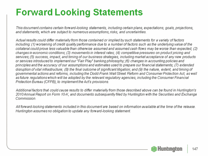 | This document contains certain forward-looking statements, including certain plans, expectations, goals, projections, and statements, which are subject to numerous assumptions, risks, and uncertainties. Actual results could differ materially from those contained or implied by such statements for a variety of factors including: (1) worsening of credit quality performance due to a number of factors such as the underlying value of the collateral could prove less valuable than otherwise assumed and assumed cash flows may be worse than expected; (2) changes in economic conditions; (3) movements in interest rates; (4) competitive pressures on product pricing and services; (5) success, impact, and timing of our business strategies, including market acceptance of any new products or services introduced to implement our "Fair Play" banking philosophy; (6) changes in accounting policies and principles and the accuracy of our assumptions and estimates used to prepare our financial statements; (7) extended disruption of vital infrastructure; (8) the final outcome of significant litigation; and (9) the nature, extent, and timing of governmental actions and reforms, including the Dodd-Frank Wall Street Reform and Consumer Protection Act, as well as future regulations which will be adopted by the relevant regulatory agencies, including the Consumer Financial Protection Bureau (CFPB), to implement the Act's provisions. Additional factors that could cause results to differ materially from those described above can be found in Huntington's 2010 Annual Report on Form 10-K, and documents subsequently filed by Huntington with the Securities and Exchange Commission. All forward-looking statements included in this document are based on information available at the time of the release. Huntington assumes no obligation to update any forward-looking statement. Forward Looking Statements 147 |