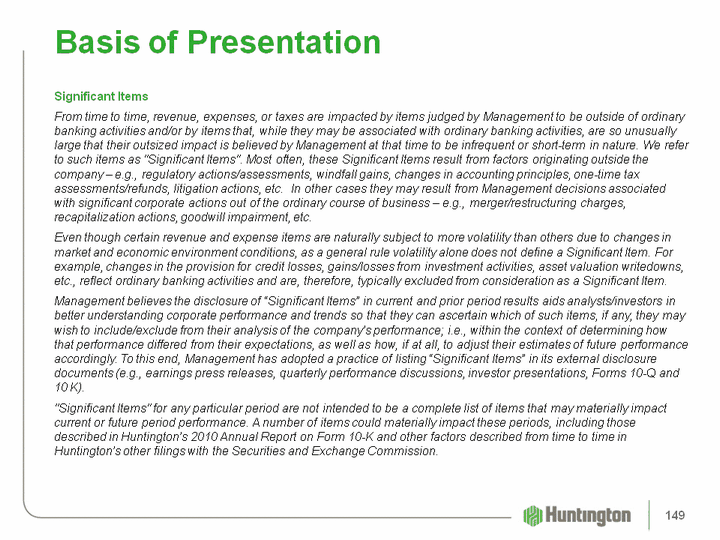 | Significant ItemsFrom time to time, revenue, expenses, or taxes are impacted by items judged by Management to be outside of ordinary banking activities and/or by items that, while they may be associated with ordinary banking activities, are so unusually large that their outsized impact is believed by Management at that time to be infrequent or short-term in nature. We refer to such items as "Significant Items". Most often, these Significant Items result from factors originating outside the company - e.g., regulatory actions/assessments, windfall gains, changes in accounting principles, one-time tax assessments/refunds, litigation actions, etc. In other cases they may result from Management decisions associated with significant corporate actions out of the ordinary course of business - e.g., merger/restructuring charges, recapitalization actions, goodwill impairment, etc. Even though certain revenue and expense items are naturally subject to more volatility than others due to changes in market and economic environment conditions, as a general rule volatility alone does not define a Significant Item. For example, changes in the provision for credit losses, gains/losses from investment activities, asset valuation writedowns, etc., reflect ordinary banking activities and are, therefore, typically excluded from consideration as a Significant Item.Management believes the disclosure of "Significant Items" in current and prior period results aids analysts/investors in better understanding corporate performance and trends so that they can ascertain which of such items, if any, they may wish to include/exclude from their analysis of the company's performance; i.e., within the context of determining how that performance differed from their expectations, as well as how, if at all, to adjust their estimates of future performance accordingly. To this end, Management has adopted a practice of listing "Significant Items" in its external disclosure documents (e.g., earnings press releases, quarterly performance discussions, investor presentations, Forms 10-Q and 10 K)."Significant Items" for any particular period are not intended to be a complete list of items that may materially impact current or future period performance. A number of items could materially impact these periods, including those described in Huntington's 2010 Annual Report on Form 10-K and other factors described from time to time in Huntington's other filings with the Securities and Exchange Commission. Basis of Presentation 149 |
