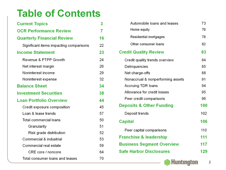| Table of Contents Current Topics 3 OCR Performance Review 7 Quarterly Financial Review 16 Significant items impacting comparisons 22 Income Statement 23 Revenue & PTPP Growth 24 Net interest margin 26 Noninterest income 29 Noninterest expense 32 Balance Sheet 34 Investment Securities 38 Loan Portfolio Overview 44 Credit exposure composition 45 Loan & lease trends 57 Total commercial loans 50 Granularity 51 Risk grade distribution 52 Commercial & industrial 53 Commercial real estate 59 CRE core / noncore 64 Total consumer loans and leases 70 Automobile loans and leases 73 Home equity 76 Residential mortgages 78 Other consumer loans 82 Credit Quality Review 83 Credit quality trends overview 84 Delinquencies 85 Net charge-offs 88 Nonaccrual & nonperforming assets 91 Accruing TDR loans 94 Allowance for credit losses 95 Peer credit comparisons 96 Deposits & Other Funding 100 Deposit trends 102 Capital 106 Peer capital comparisons 110 Franchise & leadership 111 Business Segment Overview 117 Safe Harbor Disclosures 129 2 |