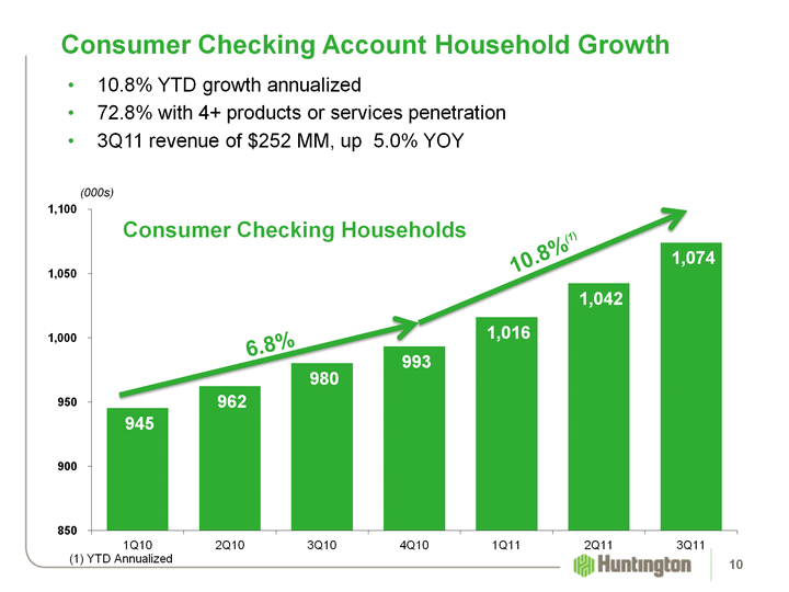 | (CHART) Consumer Checking Account Household Growth Consumer Checking Households 6.8% 10.8%(1) (1) YTD Annualized 10.8% YTD growth annualized 72.8% with 4+ products or services penetration 3Q11 revenue of $252 MM, up 5.0% YOY (000s) 10 |