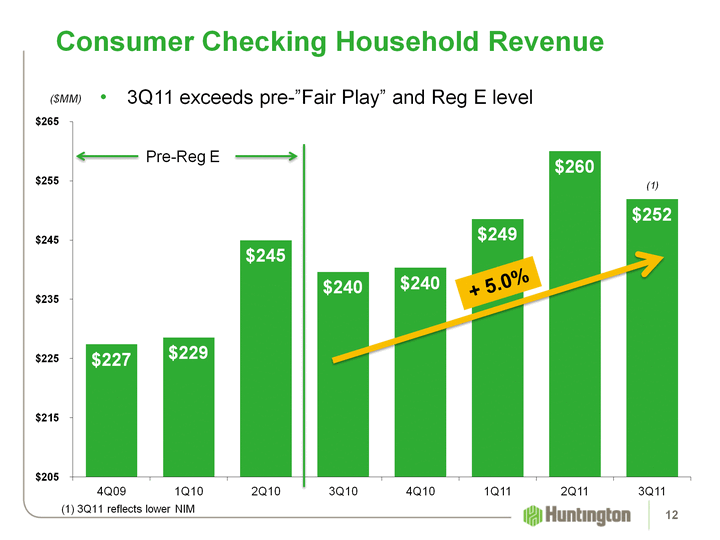 | (CHART) Consumer Checking Household Revenue + 5.0% ($MM) 3Q11 exceeds pre-"Fair Play" and Reg E level 12 Pre-Reg E (1) 3Q11 reflects lower NIM (1) |