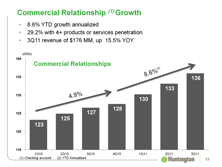 | #1 in Ohio Branches Planned Rollout 12% the cost of a traditional branch 32 opened 28 in 2011 89 by end of 2015 Cash flow breakeven in < 2 years Increase Convenience - Ohio Branch share source, SNL Financial, 6/30/2011 % of Branches % of Branches % of Branches MSA 6/11 Pro Forma (1) Pro Forma (1) Akron 8.6% 13% #2 Canton 18.0% 22% #1 Cleveland 10.3% 15% #1 Columbus 13.7% 15% #1 Youngstown 19.8% 23% #1 362 Branches + 106 In-Store = 468 Branches Over Time Giant Eagle / Huntington Partnership 126 126 |
