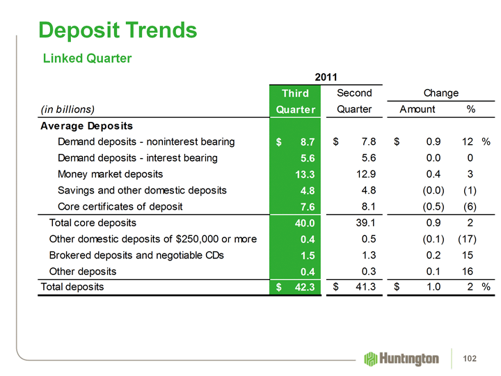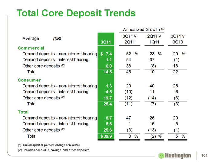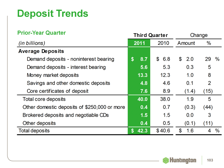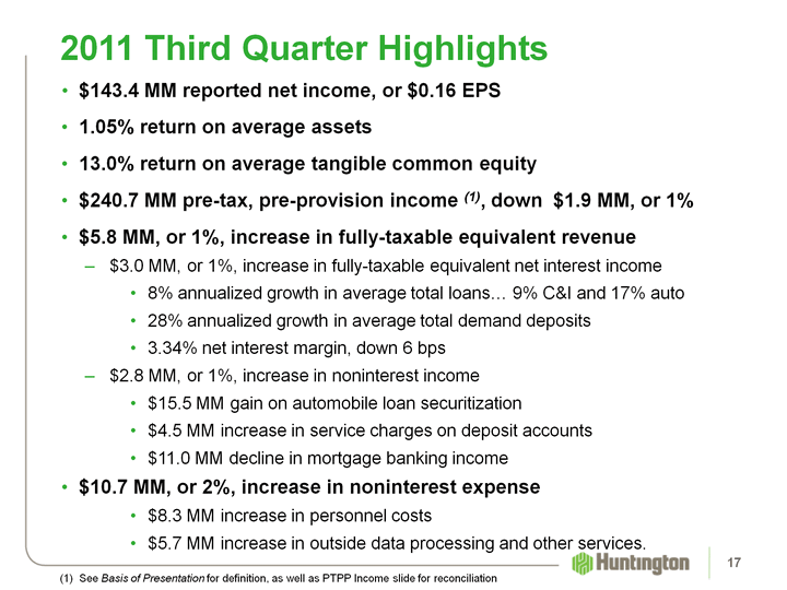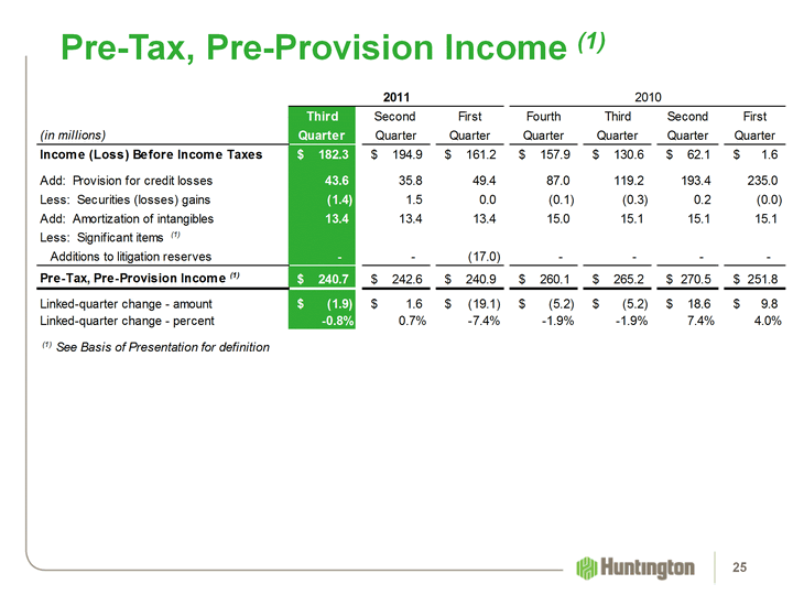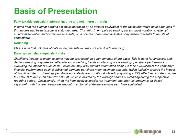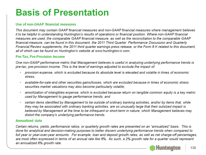 | Use of non-GAAP financial measures This document may contain GAAP financial measures and non-GAAP financial measures where management believes it to be helpful in understanding Huntington's results of operations or financial position. Where non-GAAP financial measures are used, the comparable GAAP financial measure, as well as the reconciliation to the comparable GAAP financial measure, can be found in this document, the 2011 Third Quarter Performance Discussion and Quarterly Financial Review supplements, the 2011 third quarter earnings press release, or the Form 8 K related to this document, all of which can be found on Huntington's website at www.huntington-ir.com. Pre-Tax, Pre-Provision Income One non-GAAP performance metric that Management believes is useful in analyzing underlying performance trends is pre-tax, pre-provision income. This is the level of earnings adjusted to exclude the impact of: provision expense, which is excluded because its absolute level is elevated and volatile in times of economic stress; available-for-sale and other securities gains/losses, which are excluded because in times of economic stress securities market valuations may also become particularly volatile; amortization of intangibles expense, which is excluded because return on tangible common equity is a key metric used by Management to gauge performance trends; and certain items identified by Management to be outside of ordinary banking activities, and/or by items that, while they may be associated with ordinary banking activities, are so unusually large that their outsized impact is believed by Management at the time to be infrequent or short-term in nature, which Management believes may distort the company's underlying performance trends. Annualized data Certain returns, yields, performance ratios, or quarterly growth rates are presented on an "annualized" basis. This is done for analytical and decision-making purposes to better discern underlying performance trends when compared to full year or year-over-year amounts. For example, loan and deposit growth rates, as well as net charge-off percentages, are most often expressed in terms of an annual rate like 8%. As such, a 2% growth rate for a quarter would represent an annualized 8% growth rate. Basis of Presentation 130 |