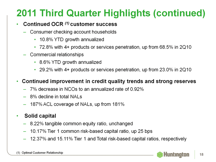 | $143.4 MM reported net income, or $0.16 EPS 1.05% return on average assets 13.0% return on average tangible common equity $240.7 MM pre-tax, pre-provision income (1), down $1.9 MM, or 1% $5.8 MM, or 1%, increase in fully-taxable equivalent revenue $3.0 MM, or 1%, increase in fully-taxable equivalent net interest income 8% annualized growth in average total loans... 9% C&I and 17% auto 28% annualized growth in average total demand deposits 3.34% net interest margin, down 6 bps $2.8 MM, or 1%, increase in noninterest income $15.5 MM gain on automobile loan securitization $4.5 MM increase in service charges on deposit accounts $11.0 MM decline in mortgage banking income $10.7 MM, or 2%, increase in noninterest expense $8.3 MM increase in personnel costs $5.7 MM increase in outside data processing and other services. 2011 Third Quarter Highlights See Basis of Presentation for definition, as well as PTPP Income slide for reconciliation 17 |