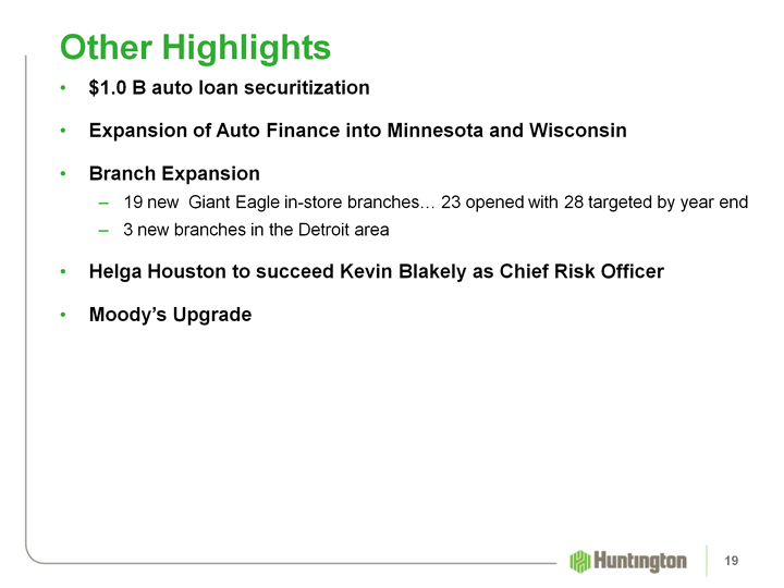 | Continued OCR (1) customer success Consumer checking account households 10.8% YTD growth annualized 72.8% with 4+ products or services penetration, up from 68.5% in 2Q10 Commercial relationships 8.6% YTD growth annualized 29.2% with 4+ products or services penetration, up from 23.0% in 2Q10 Continued improvement in credit quality trends and strong reserves 7% decrease in NCOs to an annualized rate of 0.92% 8% decline in total NALs 187% ACL coverage of NALs, up from 181% Solid capital 8.22% tangible common equity ratio, unchanged 10.17% Tier 1 common risk-based capital ratio, up 25 bps 12.37% and 15.11% Tier 1 and Total risk-based capital ratios, respectively 2011 Third Quarter Highlights (continued) Optimal Customer Relationship 18 |