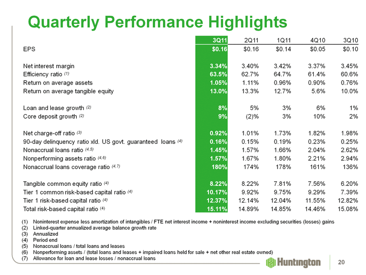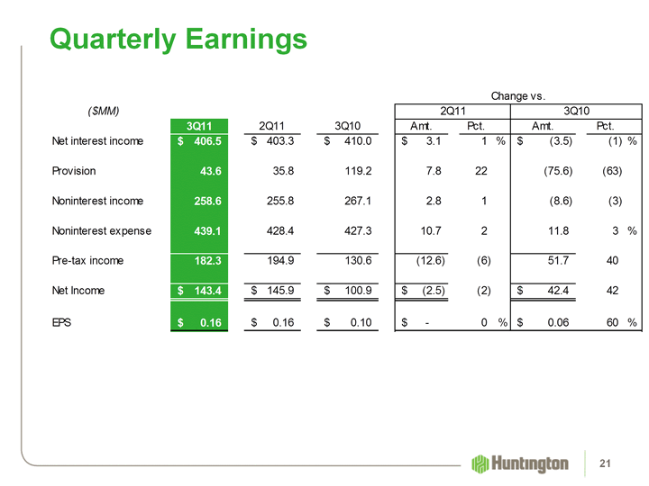 | Quarterly Performance Highlights 3Q11 2Q11 1Q11 4Q10 3Q10 EPS $0.16 $0.16 $0.14 $0.05 $0.10 Net interest margin 3.34% 3.40% 3.42% 3.37% 3.45% Efficiency ratio (1) 63.5% 62.7% 64.7% 61.4% 60.6% Return on average assets 1.05% 1.11% 0.96% 0.90% 0.76% Return on average tangible equity 13.0% 13.3% 12.7% 5.6% 10.0% Loan and lease growth (2) 8% 5% 3% 6% 1% Core deposit growth (2) 9% (2)% 3% 10% 2% Net charge-off ratio (3) 0.92% 1.01% 1.73% 1.82% 1.98% 90-day delinquency ratio xld. US govt. guaranteed loans (4) 0.16% 0.15% 0.19% 0.23% 0.25% Nonaccrual loans ratio (4,5) 1.45% 1.57% 1.66% 2.04% 2.62% Nonperforming assets ratio (4,6) 1.57% 1.67% 1.80% 2.21% 2.94% Nonaccrual loans coverage ratio (4,7) 180% 174% 178% 161% 136% Tangible common equity ratio (4) 8.22% 8.22% 7.81% 7.56% 6.20% Tier 1 common risk-based capital ratio (4) 10.17% 9.92% 9.75% 9.29% 7.39% Tier 1 risk-based capital ratio (4) 12.37% 12.14% 12.04% 11.55% 12.82% Total risk-based capital ratio (4) 15.11% 14.89% 14.85% 14.46% 15.08% (1) Noninterest expense less amortization of intangibles / FTE net interest income + noninterest income excluding securities (losses) gains Linked-quarter annualized average balance growth rate Annualized Period end Nonaccrual loans / total loans and leases Nonperforming assets / (total loans and leases + impaired loans held for sale + net other real estate owned) Allowance for loan and lease losses / nonaccrual loans 20 |