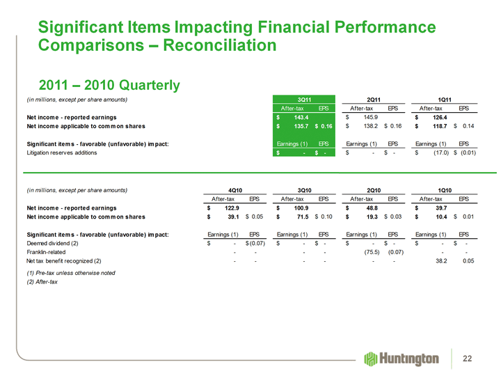 | Significant Items Impacting Financial Performance Comparisons - Reconciliation 2011 - 2010 Quarterly 22 |