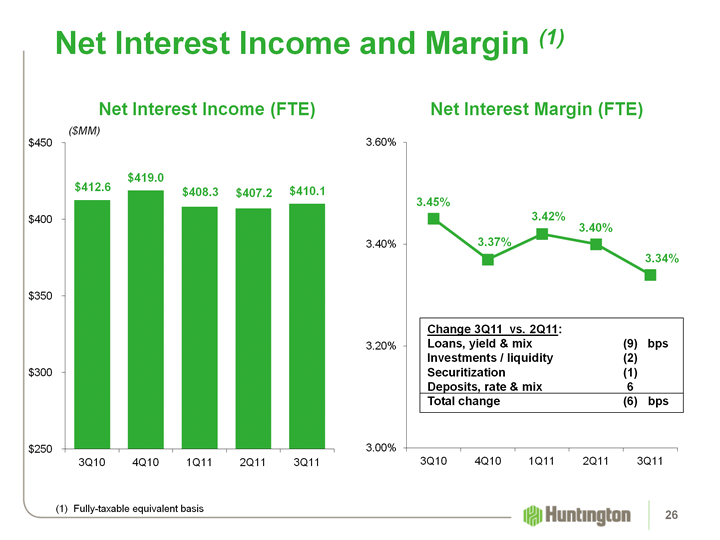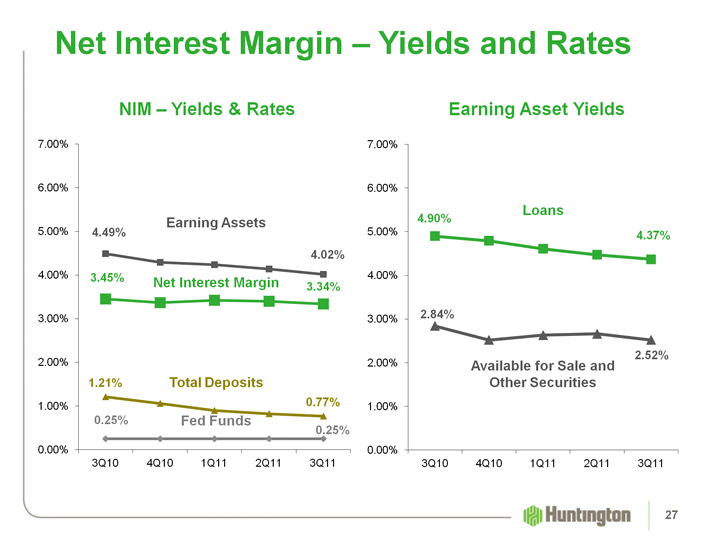 | (CHART) (CHART) Change 3Q11 vs. 2Q11: Loans, yield & mix (9) bps Investments / liquidity (2) Securitization (1) Deposits, rate & mix 6 Total change (6) bps Net Interest Income and Margin (1) ($MM) (1) Fully-taxable equivalent basis Net Interest Margin (FTE) Net Interest Income (FTE) 26 |