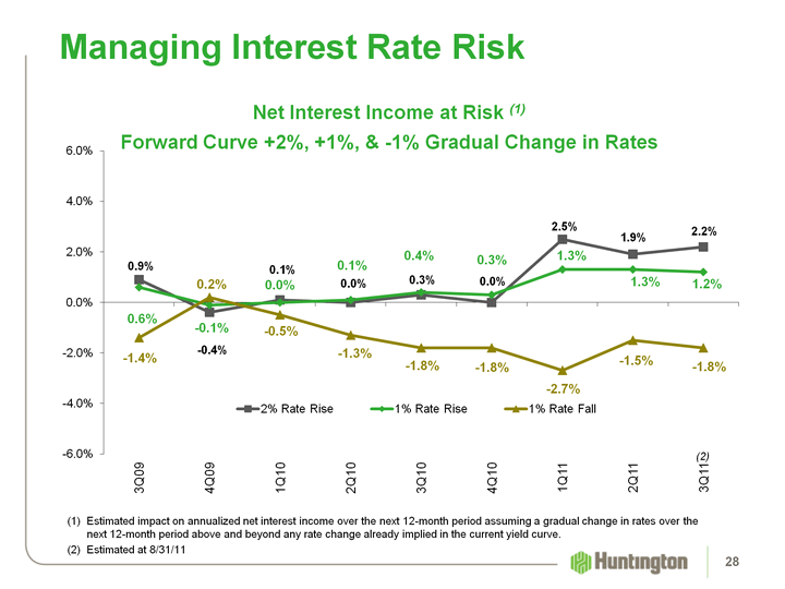 | Net Interest Income at Risk (1) Forward Curve +2%, +1%, & -1% Gradual Change in Rates (CHART) Managing Interest Rate Risk Estimated impact on annualized net interest income over the next 12-month period assuming a gradual change in rates over the next 12-month period above and beyond any rate change already implied in the current yield curve. Estimated at 8/31/11 (2) 28 |