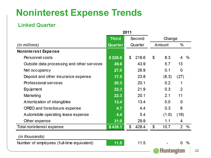 | Mortgage Banking Income ($MM) 3Q11 2Q11 1Q11 4Q10 3Q10 Origination and secondary marketing $15.6 $11.5 $19.8 $48.2 $35.8 Servicing fees 12.1 12.4 12.5 11.5 12.1 Amortization of capitalized servicing (9.6) (9.1) (9.9) (14.0) (13.0) Other mortgage banking income 3.8 4.3 3.8 4.8 5.0 Sub-total 22.0 19.1 26.2 50.5 39.9 MSR recovery (impairment) (39.4) (8.3) 0.8 31.3 (12.0) Net trading gains (losses) 30.2 13.0 (4.3) (28.7) 24.2 Total $12.8 $23.8 $22.7 $53.2 $52.0 Investor servicing portfolio (1) ($B) $16.1 $16.3 $16.5 $15.9 $15.7 Weighted average coupon 5.20% 5.23% 5.27% 5.35% 5.48% Originations ($B) $1.0 $0.9 $0.9 $1.8 $1.6 Mortgage servicing rights (1) $145.3 $189.7 $202.6 $196.2 $161.6 MSR % of investor servicing portfolio (1) 0.90% 1.16% 1.23% 1.23% 1.03% (1) End-of-period 31 |