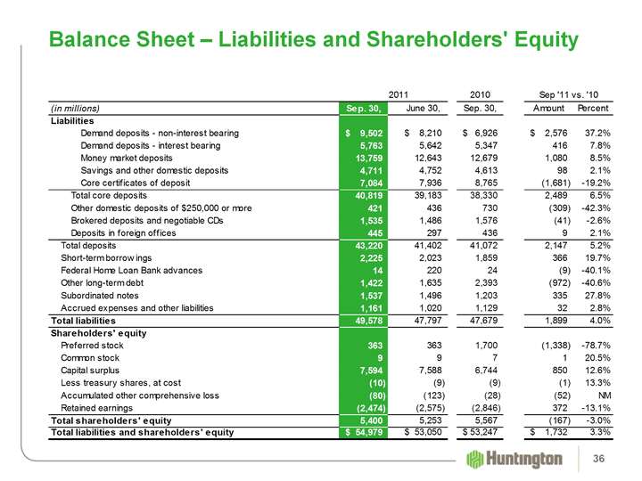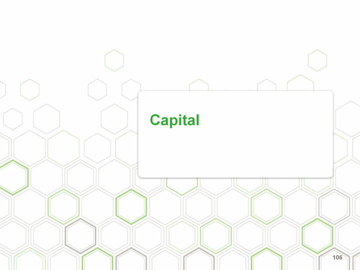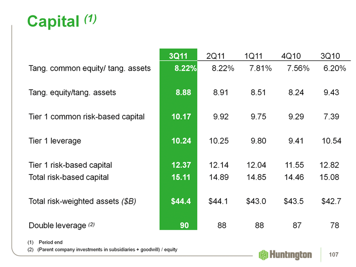 | Capital (1) 3Q11 2Q11 1Q11 4Q10 3Q10 Tang. common equity/ tang. assets 8.22% 8.22% 7.81% 7.56% 6.20% Tang. equity/tang. assets 8.88 8.91 8.51 8.24 9.43 Tier 1 common risk-based capital 10.17 9.92 9.75 9.29 7.39 Tier 1 leverage 10.24 10.25 9.80 9.41 10.54 Tier 1 risk-based capital 12.37 12.14 12.04 11.55 12.82 Total risk-based capital 15.11 14.89 14.85 14.46 15.08 Total risk-weighted assets ($B) $44.4 $44.1 $43.0 $43.5 $42.7 Double leverage (2) 90 88 88 87 78 (1) Period end (2) (Parent company investments in subsidiaries + goodwill) / equity 107 |
