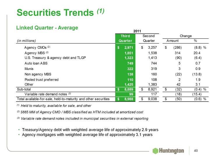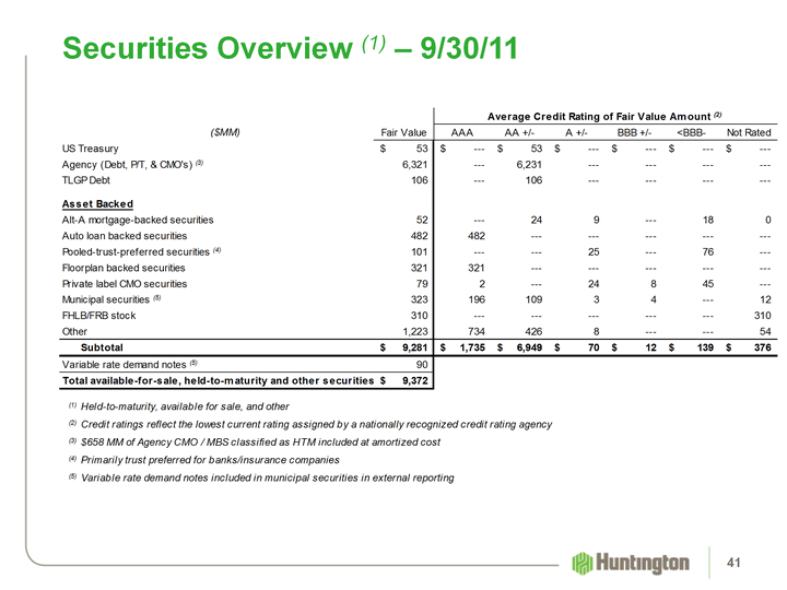 | Securities Trends (1) Linked Quarter - Average Treasury/Agency debt with weighted average life of approximately 2.9 years Agency mortgages with weighted average life of approximately 3.1 years 40 |