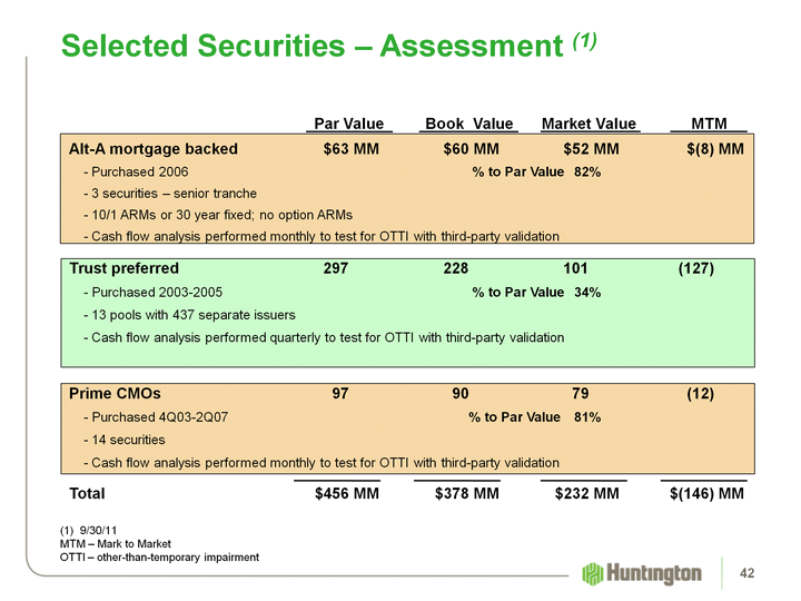 | Selected Securities - Assessment (1) Par Value Book Value Market Value MTM Alt-A mortgage backed $63 MM $60 MM $52 MM $(8) MM - Purchased 2006 % to Par Value 82% - 3 securities - senior tranche - 10/1 ARMs or 30 year fixed; no option ARMs - Cash flow analysis performed monthly to test for OTTI with third-party validation Trust preferred 297 228 101 (127) - Purchased 2003-2005 % to Par Value 34% - 13 pools with 437 separate issuers - Cash flow analysis performed quarterly to test for OTTI with third-party validation Prime CMOs 97 90 79 (12) - Purchased 4Q03-2Q07 % to Par Value 81% - 14 securities - Cash flow analysis performed monthly to test for OTTI with third-party validation Total $456 MM $378 MM $232 MM $(146) MM 9/30/11 MTM - Mark to Market OTTI - other-than-temporary impairment 42 |