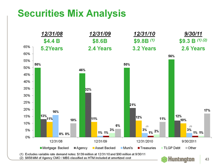 | (CHART) Securities Mix Analysis 12/31/10 $9.8B (1) 3.2 Years 12/31/08 $4.4 B 5.2Years 12/31/09 $8.6B 2.4 Years Excludes variable rate demand notes: $139 million at 12/31/10 and $90 million at 9/30/11 $658 MM of Agency CMO / MBS classified as HTM included at amortized cost (1) 9/30/11 $9.3 B (1) (2) 2.6 Years 43 (1) |