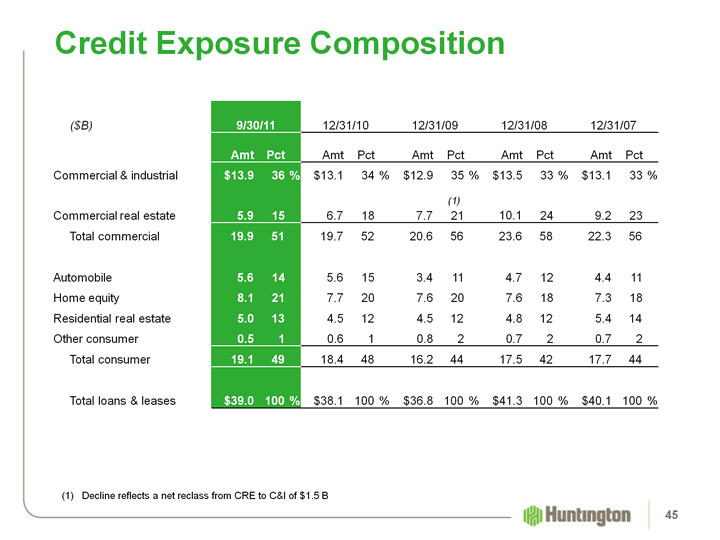 | ($B) 9/30/11 9/30/11 9/30/11 12/31/10 12/31/10 12/31/10 12/31/09 12/31/09 12/31/09 12/31/08 12/31/08 12/31/08 12/31/07 12/31/07 12/31/07 Amt Pct Amt Pct Amt Pct Amt Pct Amt Pct Commercial & industrial $13.9 36 % $13.1 34 % $12.9 35 % $13.5 33 % $13.1 33 % Commercial real estate 5.9 15 6.7 18 7.7 21 10.1 24 9.2 23 Total commercial 19.9 51 19.7 52 20.6 56 23.6 58 22.3 56 Automobile 5.6 14 5.6 15 3.4 11 4.7 12 4.4 11 Home equity 8.1 21 7.7 20 7.6 20 7.6 18 7.3 18 Residential real estate 5.0 13 4.5 12 4.5 12 4.8 12 5.4 14 Other consumer 0.5 1 0.6 1 0.8 2 0.7 2 0.7 2 Total consumer 19.1 49 18.4 48 16.2 44 17.5 42 17.7 44 Total loans & leases $39.0 100 % $38.1 100 % $36.8 100 % $41.3 100 % $40.1 100 % Credit Exposure Composition (1) Decline reflects a net reclass from CRE to C&I of $1.5 B (1) 45 |