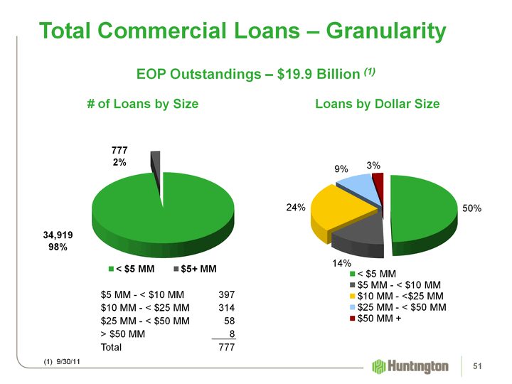 | (CHART) Total Commercial Loans - Granularity EOP Outstandings - $19.9 Billion (1) (CHART) 777 2% 34,919 98% (1) 9/30/11 Loans by Dollar Size # of Loans by Size $5 MM - < $10 MM 397 $10 MM - < $25 MM 314 $25 MM - < $50 MM 58 > $50 MM 8 Total 777 51 |