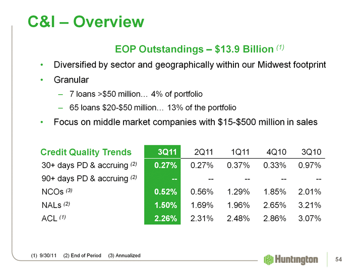 | C&I - Overview EOP Outstandings - $13.9 Billion (1) Diversified by sector and geographically within our Midwest footprint Granular 7 loans >$50 million... 4% of portfolio 65 loans $20-$50 million... 13% of the portfolio Focus on middle market companies with $15-$500 million in sales Credit Quality Trends (1) 9/30/11 (2) End of Period (3) Annualized 3Q11 2Q11 1Q11 4Q10 3Q10 30+ days PD & accruing (2) 0.27% 0.27% 0.37% 0.33% 0.97% 90+ days PD & accruing (2) -- -- -- -- -- NCOs (3) 0.52% 0.56% 1.29% 1.85% 2.01% NALs (2) 1.50% 1.69% 1.96% 2.65% 3.21% ACL (1) 2.26% 2.31% 2.48% 2.86% 3.07% 54 |
